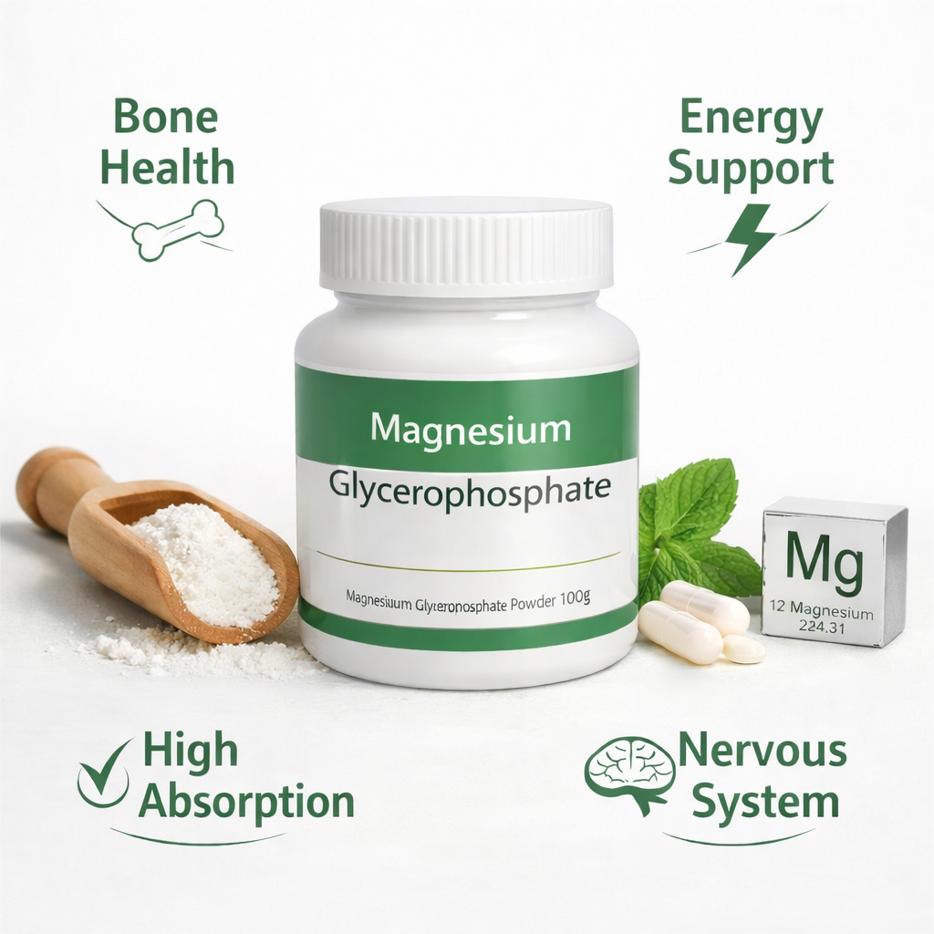 Magnesium Glycerophosphate is a highly bioavailable magnesium supplement that supports bone health, muscle function, and nervous system balance. This mineral compound is gentle on the stomach and ideal for maintaining daily magnesium levels. It is commonly incorporated into tablets, capsules, effervescent powders, and functional beverages, making it versatile for dietary supplement formulations. Perfect for health-conscious consumers looking for high-quality magnesium sources in their daily nutrition.